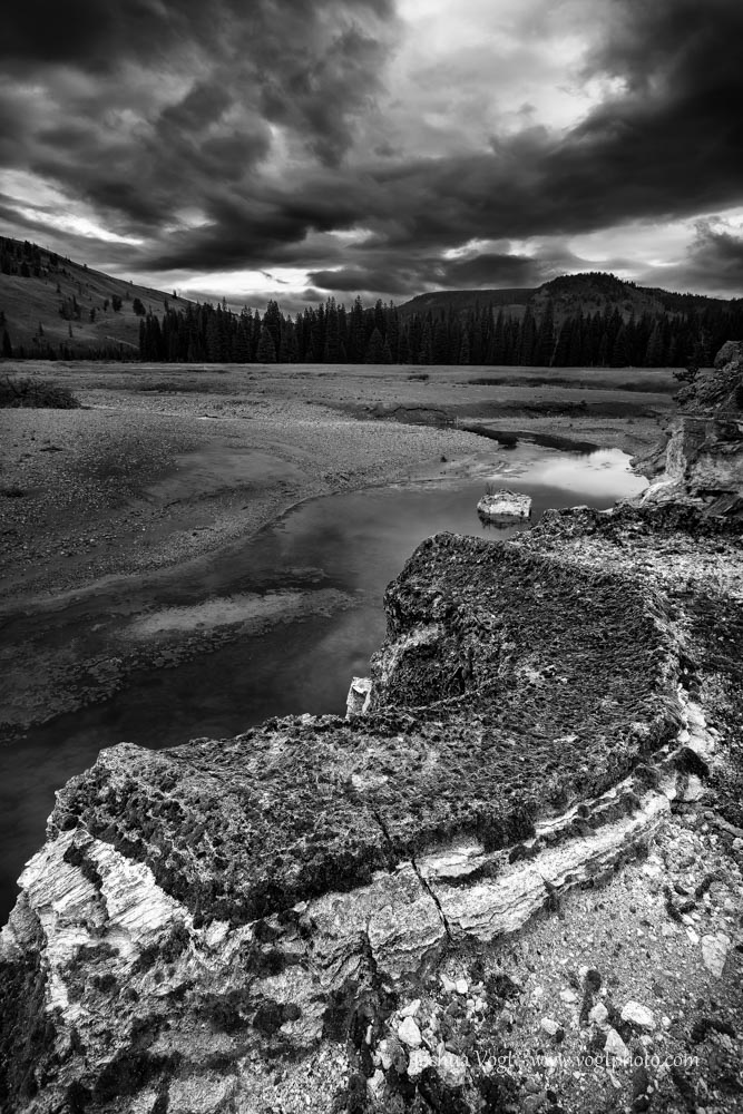 Around sunset, the storm broke up just a bit to create some interesting light and cloud formations while several extinct hot springs along the river banks made for some interesting and very unique views.  The next day, we continued on our hike and the rain continued to fall.  We had to ford the Snake River again (which was still deep and fast moving) and then continued up the Snake River Cutoff Trail to press on to our second campsite on the upper Snake River (campsite 8C4).  While hiking the cutoff trail, the trail faded in and out and I eventually lost the trail completely.  Thankfully, I’m quite comfortable hiking off trail with just a map and compass to navigate, but from the looks on my companion’s faces, especially the two from NYC, they were less comfortable with the situation!  We arrived at our camp later than expected, soaked to the bone, and cold.  We built a big fire to warm up and attempt to dry off, ate dinner, and then crawled into our damp sleeping bags for the night.