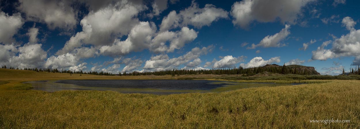 Puffy Clouds drift by a small pond surrounded by a grassy meadow on top of the plateau southwest of Trappers Peak in the Flat Tops Wilderness of Colorado.