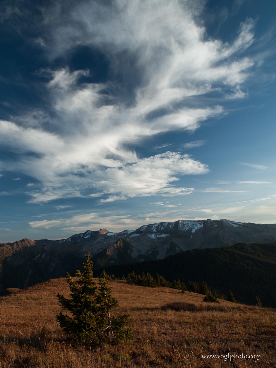 An interesting cloud forms over a lone tree on top of Arkansas Peak with the massive Treasure Mountain looming in the distance.