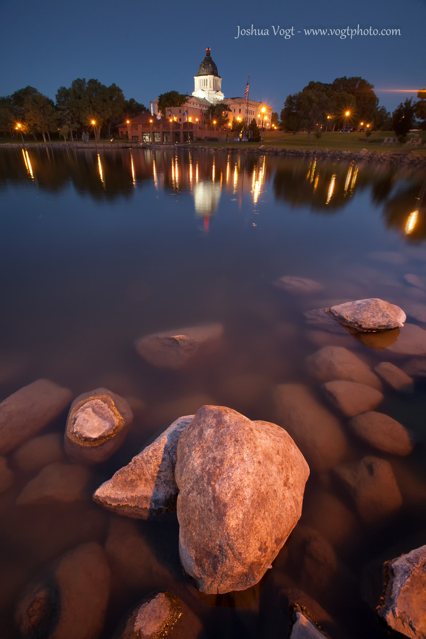 To demonstrate the limitations of even my high end camera system, have a look at this series of pictures of the Capitol Building in Pierre, SD. Below, in the first image there are two major issues that stand out to me: First, by focusing on the rock at the bottom of the frame, the Capitol and grounds are blurry because my camera can’t keep both the close up rock and far away capitol building in sharp focus. In fact, even with a wide angle lens, the focus zone is so small that the rock sticking out of the water on the right middle of the frame is already out of focus. Second, by exposing for how much light the rock needed to be properly lit, the capitol and grounds are overexposed and in the case of the capitol building, so overexposed there is no detail in that area, just pure white. After all, cameras are just machines and can only record so much of a range of light, much less than the range we see with our eyes, and I have exceeded that range with my camera in the image below.