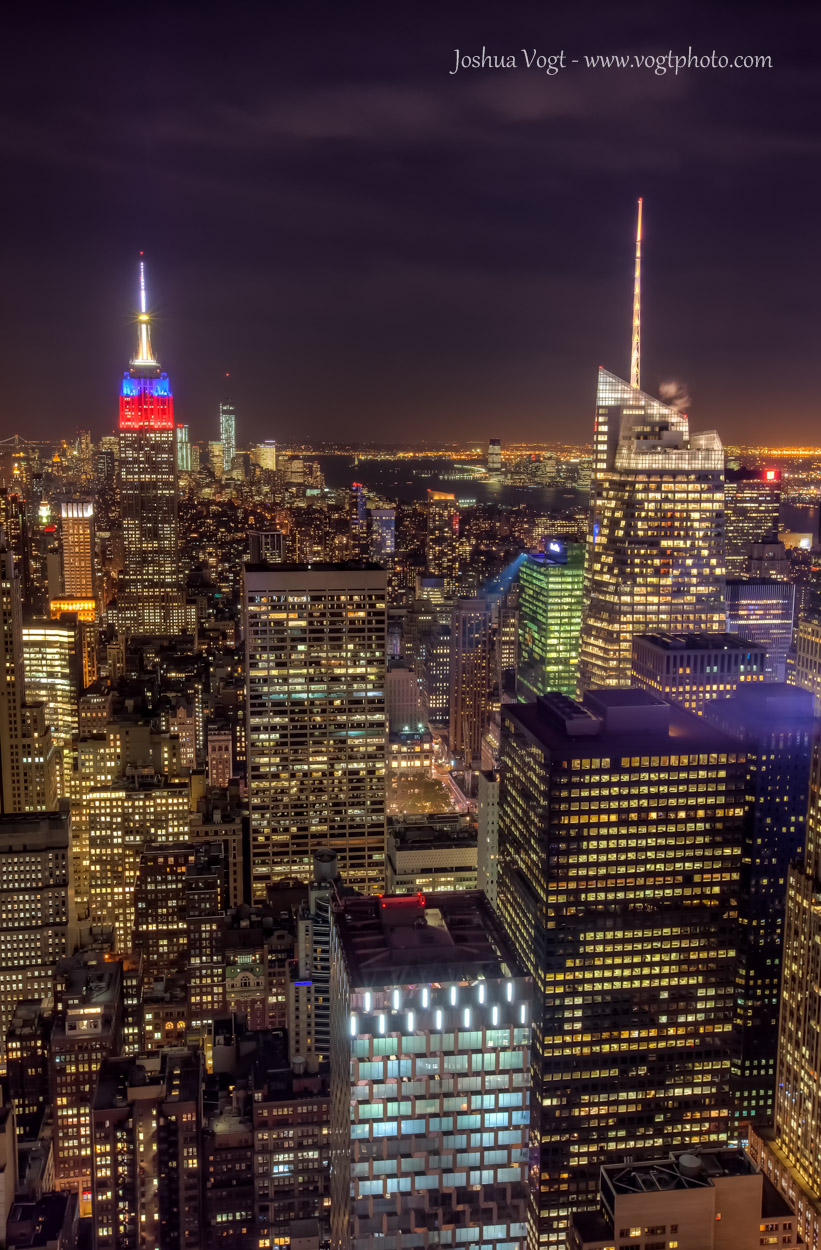To prepare for the shoot, I went on Rockefeller Center’s website and couldn’t find anything regarding restrictions, so I think “Sweet! I’m bringing my tripod!” Unfortunately, once purchasing the tickets in the lobby that night, in huge bold letters on the ticket, it said “No Tripods Allowed.” I’m thinking, “How can I get a sharp image in such low light without my tripod!?!” I decided to nonchalantly carry my tripod up to the observation deck (I had been carrying it around Manhattan all day), and if the opportunity presented itself, I’d thumb my nose at authority in pursuit of a sharp image. I stayed away from the crowded areas of the observation deck and it turns out, the security guards turned a blind eye to me and my tripod!